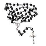 Men's black rosary necklace. Made with round 6mm black wood beads. The rosary circle measures 70cm around. 9cm drop to the cross. Finished in a silver plating. Lobster clasp. Read more